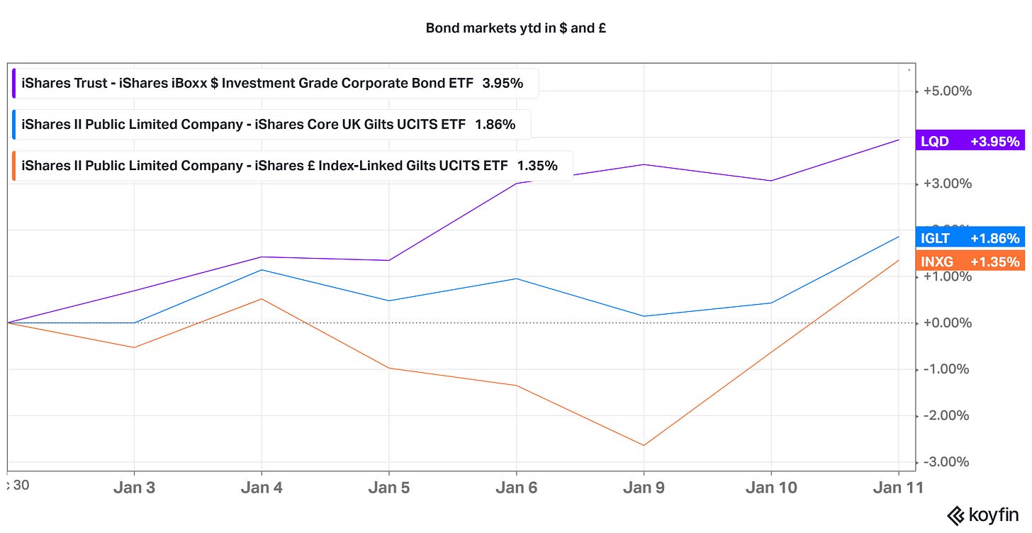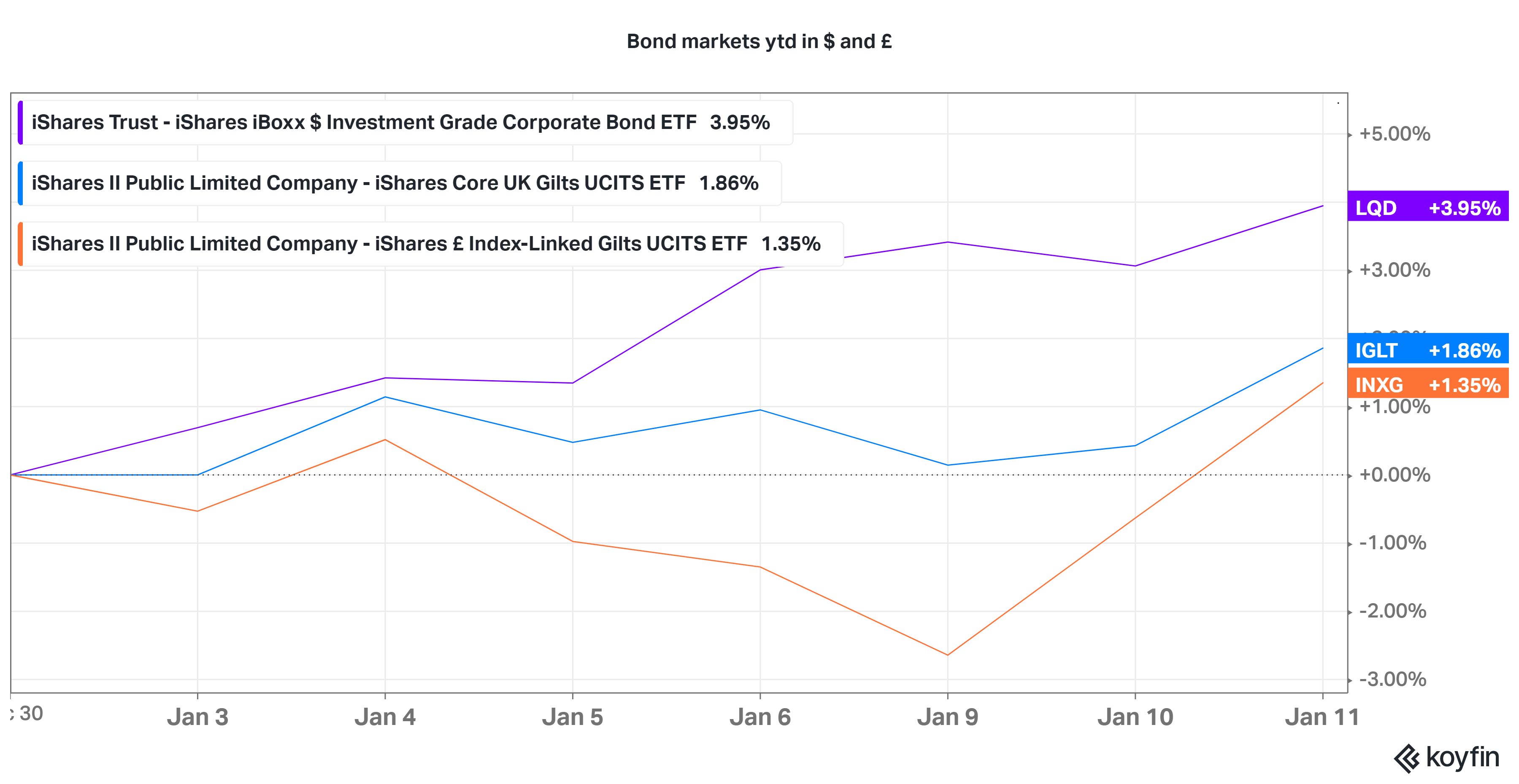 Today’s CPI data in the US will be closely watched, the expectation is for a fall in the headline inflation number. For now this continues to be **the** thing to watch, and I think we should expect surprises in BOTH directions on this during the year. Bonds are up and 10-year interest rates are down (by 0.3-0.4%).